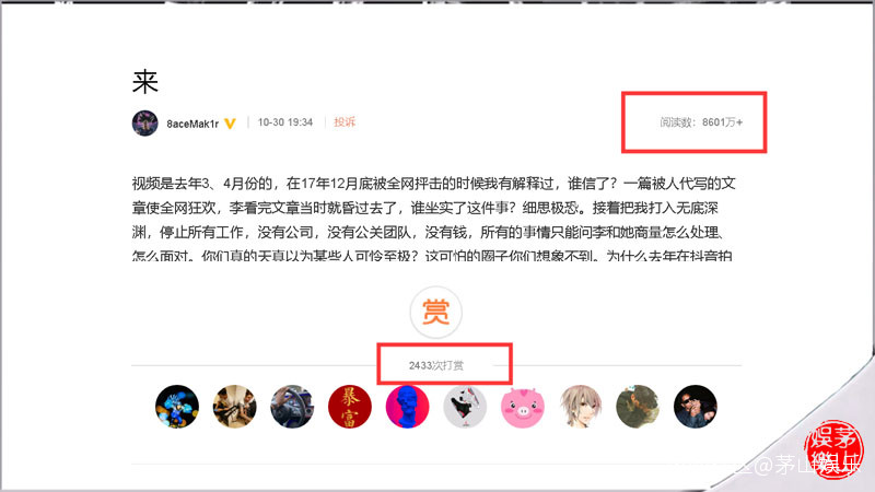 微博截圖而令人想不到了是,一天後,截止發稿,PGOne的這篇長文收穫了8600多萬的閲讀量,同時有2400多人(2433人,而且這一數字還在增長)給予打賞,而前10名粉絲共打賞了8442.7塊,即便其它的打賞都按最低9.9元計算的話,那PGOne這一天收穫的“安慰”打賞也有3萬2千多塊。當然,這與1年多前,賈乃亮一篇文章被打賞了近200萬比起來還是少了很多(當時有9000多人打賞,200萬的金額應該不是太確切)。