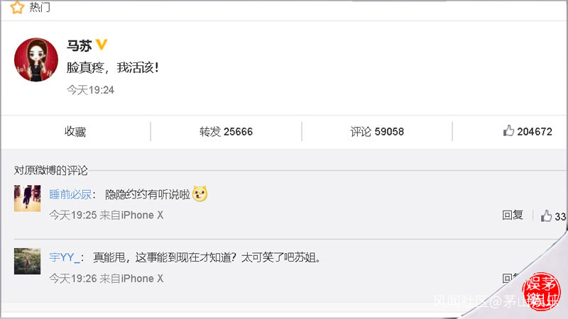 微博截圖當然,畢竟不是當事人李小璐或者她工作室的直接回應,那麼網傳的消息是真是假就難以分辨了。而讓人想不到的是,與李小璐、賈乃亮同為好友的馬蘇卻在當晚19:24分在微博發文稱“臉真疼,我活該!”,遙想2017年底她曾發消息給賈乃亮幫“閨蜜”李小璐解釋,稱“萬萬(PGone)是我們的親弟弟,聚餐負責給我們拍照,喝多替我們提包”。而早前,馬蘇可是PGone的“迷姐”,是她牽線PGone與李小璐、賈乃亮認識的。