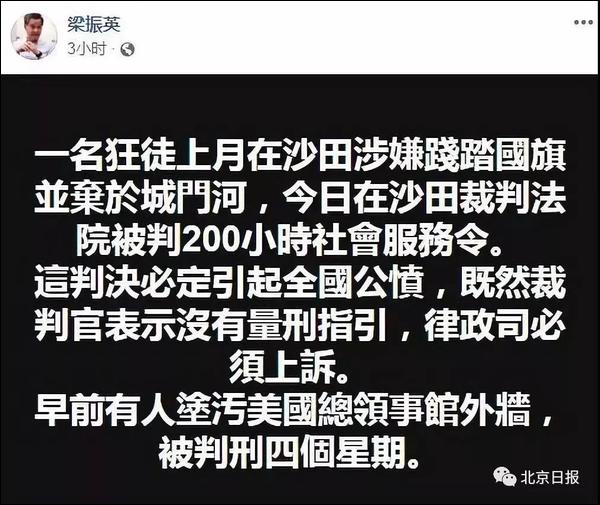 此案宣判後,不少香港市民及網友認為法院判決過輕,有愛國愛港人士直言“對香港法治失望”,這個判決“必定引起全國公憤”。29日晚上,全國政協副主席梁振英在社交媒體發文稱,律政司必須上訴。梁振英提到,早前有人塗污美國總領事館外牆,被判刑四個星期。