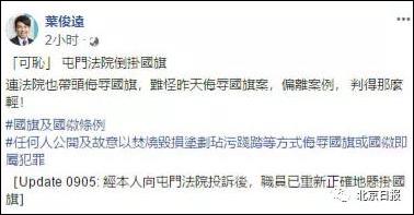 10月30日,民建聯成員葉俊遠在個人社交網Facebook上曝出一張圖片,指屯門法院倒掛國旗。他發文批評:“‘可恥’屯門法院倒掛國旗,連法院也帶頭侮辱國旗,難怪昨天侮辱國旗案,偏離案例,判得那麼輕!”
