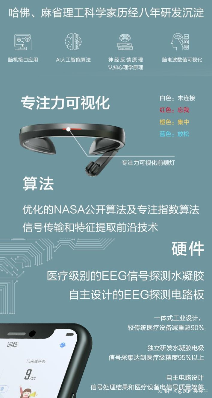如果再看看他們自己的介紹,你就會有一種“亂花漸欲迷人眼”的感覺:這也太牛逼了吧?哈佛、麻省理工科學家歷經八年研發沉澱;腦機接口;AI人工智能算法;神經反饋;認知心理學;腦電波數值可視化;NASA算法;醫療界別。