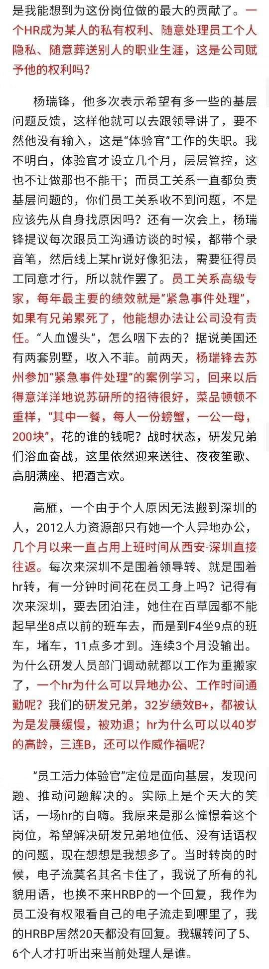 這封長帖中的瓜太多,市界先明確下帖文中的人物關係:舉報者胡玲為華為2012實驗室HR,是“員工活力體驗官”,負責解決2.5萬+研發的工作體驗問題(如加班、班車、食堂等)。被舉報人楊瑞鋒是胡的導師及leader,高雁是中途調過來幫胡的女同事。以下為帖文的主要信息點: