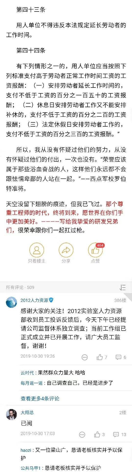 根據網上截圖顯示,10月30日晚19:26分時,華為2012人力資源部出面評論稱:2012實驗室人力資源部收到員工投訴反饋後,今天下午已經提前公司監督體系獨立調查,當前工作組已經正式成立並已展開工作,請廣大員工監督。