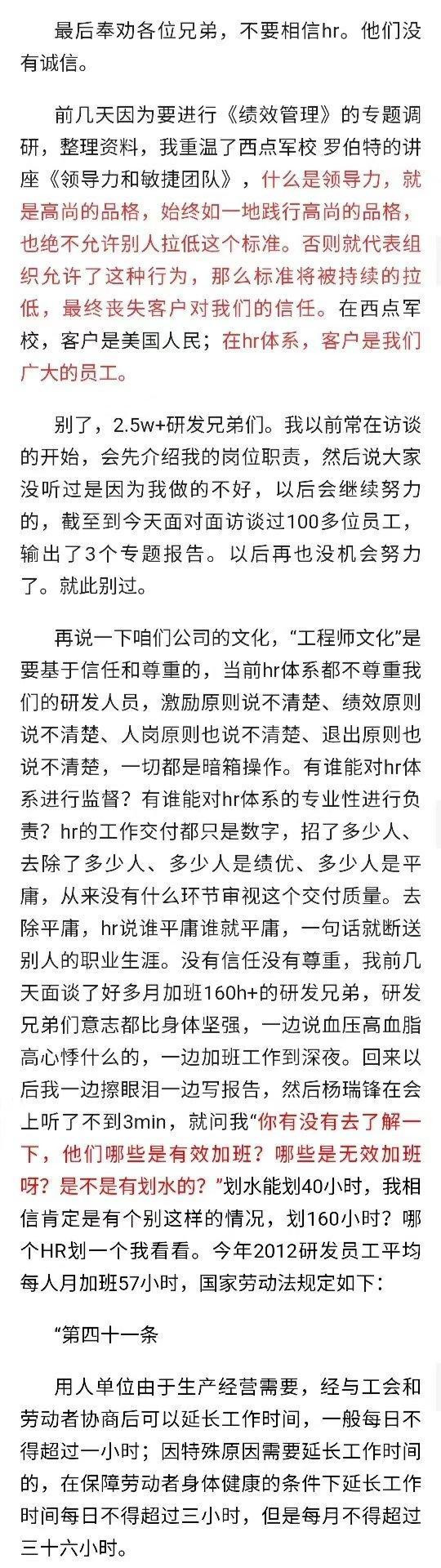 6、楊説,有的員工假裝加班,健身之後才回到工位假裝加班,這是考勤造假業務造假,裏面有大問題,要求大家深挖。還認為有人加班160個小時可能是划水。胡認為,員工免費加班,不給錢不給調休,為什麼不可以運動一下?每月加班160個小時,研發兄弟高血壓高血脂還仍然深夜加班,划水劃160個小時,你劃一個我看?