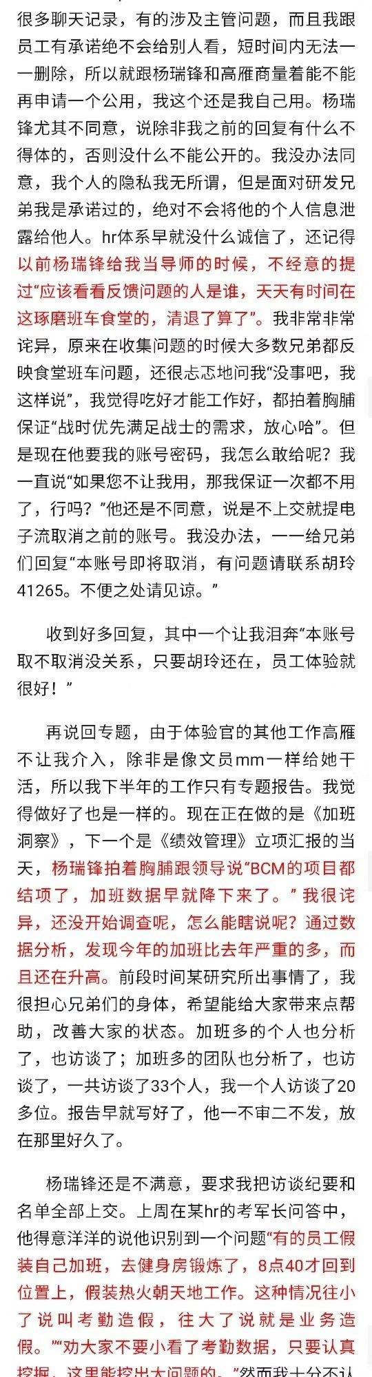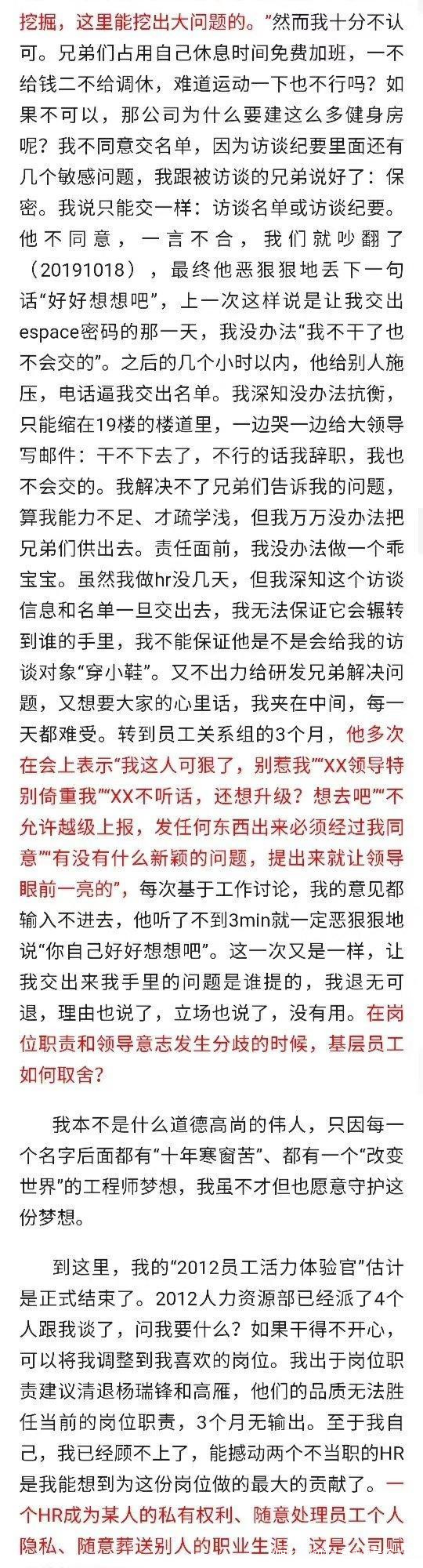 7、楊要求胡交出與員工的訪談記錄及名單,裏面涉及員工反饋的敏感問題,胡出於對研發員工的保護擔心員工被“穿小鞋”,誓死不交,胡被逼到樓道里哭。