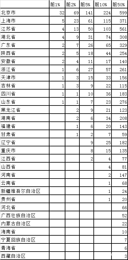 從各省級行政區的上榜學科數量分佈看,北京佔據絕對優勢,在各層次的學科數都高居全國第一。上海的前1%學科數、前2%學科數、前5%學科數、前10%學科數均位列全國第二,頂尖學科數量優勢明顯。江蘇的前50%學科數僅次於北京,彰顯了雄厚的整體實力。湖北、廣東、浙江、陝西等省的頂尖學科數量和上榜學科總數也都處於國內前列。