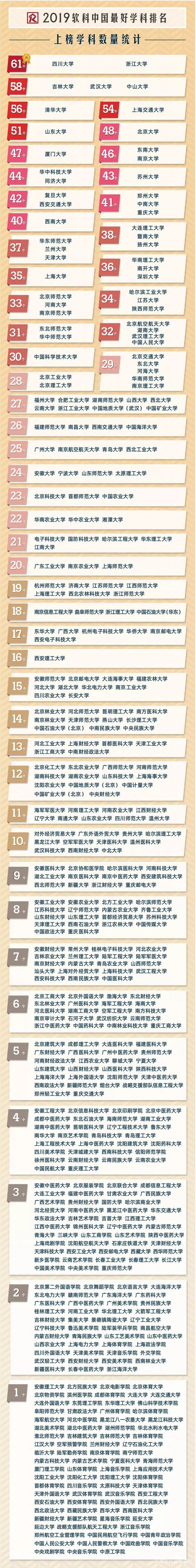 按照上榜次數統計,四川大學和浙江大學均有61個學科上榜,領先國內其它高校,吉林大學、武漢大學、中山大學、清華大學、上海交通大學、山東大學的上榜學科數也都超過50個。