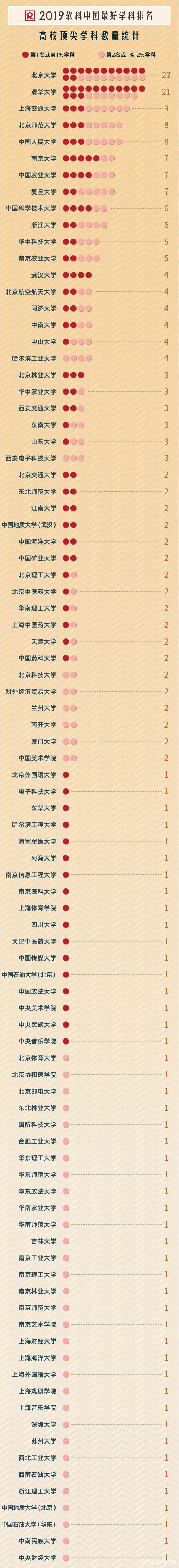 從全國第一名或者前1%學科數量來看,清華大學有14個,北京大學有13個。南京大學有5個,中國農業大學、中國科學技術大學和武漢大學各有4個。