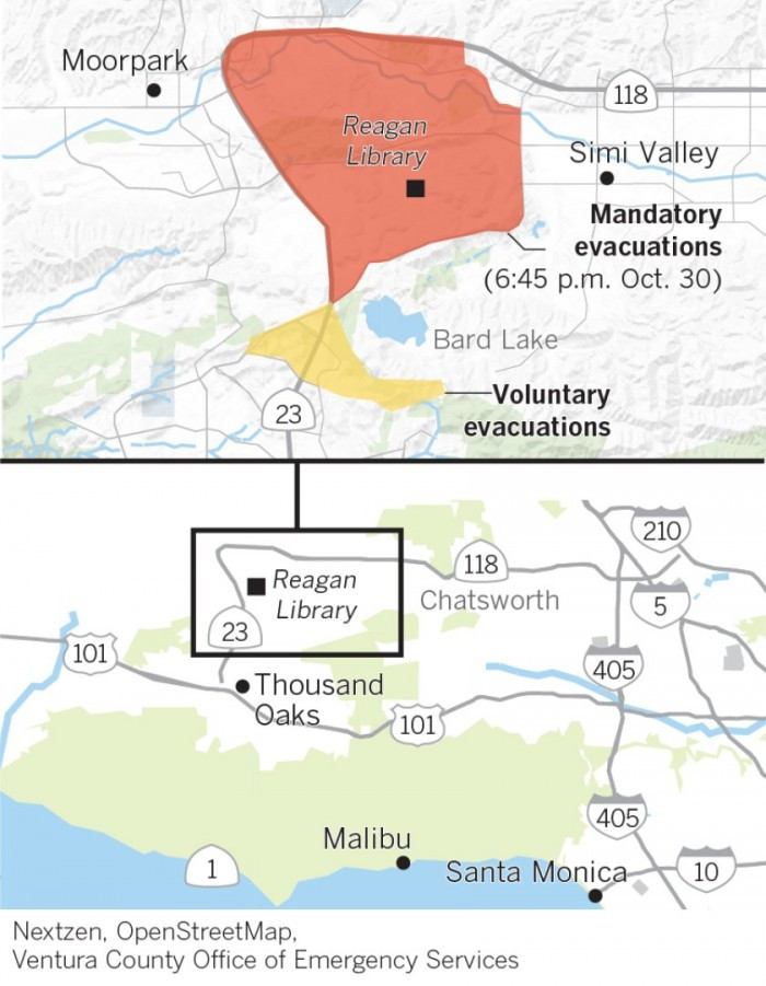 據《今日美國》報道,受強風影響,當地時間10月30日早晨,美國加州洛杉磯東北部爆發了一場新的大火,火勢迫近至羅納德·里根總統圖書館跟前,不過由於長期在附近放牧的山羊吃掉了其周邊的灌木,圖書館免遭大火摧毀。