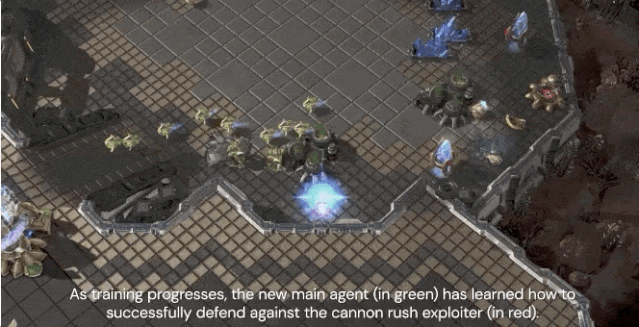 比如,藍色是主要玩家,負責贏,紅色是幫它成長的陪練。小紅髮現了一種cannon rush技能,小藍沒能抵擋住: