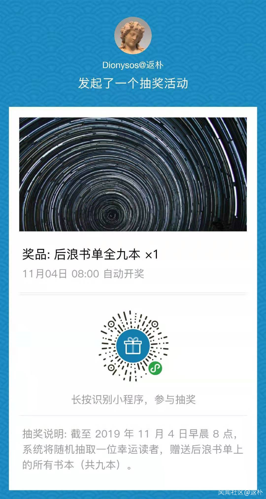 近日,後浪出版公司向廣大讀者推薦了一套硬核科普書籍,併為返樸讀者提供了抽獎機會:至2019年11月4日,系統將隨機挑選一位幸運讀者,贈送後浪書單上的所有書籍,掃描下方小程序碼即可參與!