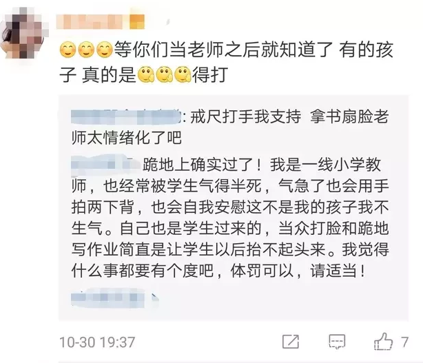 支持老師的表示“等你們當老師之後就知道了,有的孩子真的是得打”。反對的人表示“戒尺打手我支持,拿書扇臉的老師太情緒化了,體罰可以,要有個度。”中立觀點的人表示“一旦動手了就是錯的,老師不是聖人,不可能每個學生都教好,何必大費周章呢?還又打又罵的。”