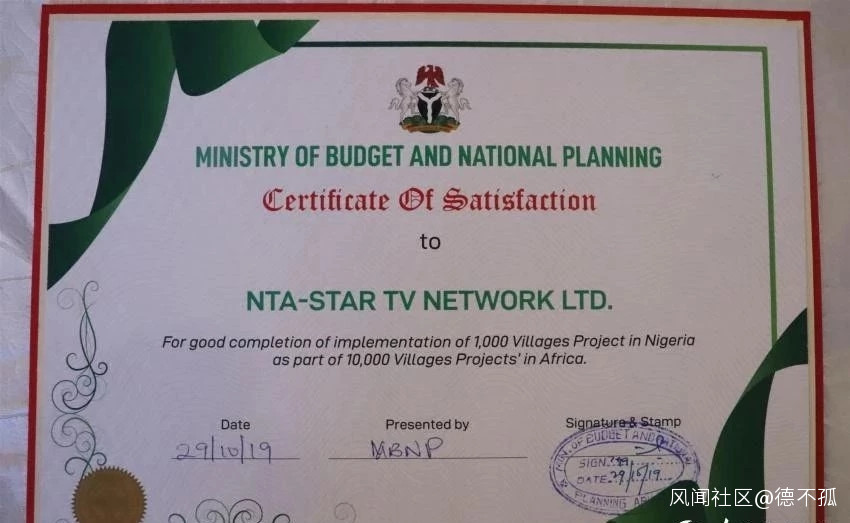 尼聯邦預算計劃部為四達時代尼日利亞公司頒發的工程滿意證書 (圖源:人民網)