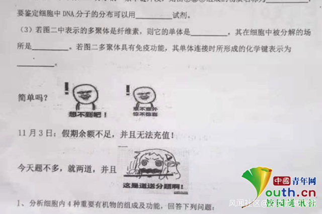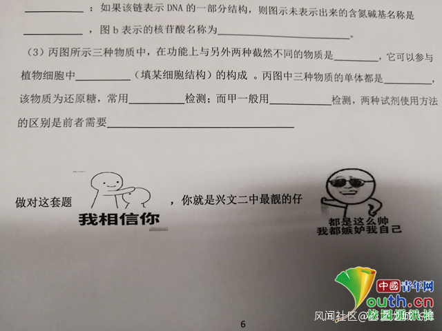 記者瞭解到,該試卷是興文二中高一15班的月假作業,試題配有表情包和一些有趣的文字,如“做對這套題,我相信你就是興文二中最靚的仔”是試卷最後的配字,其中“我相信你”採用了表情包的形式展示。試卷中還有多處帶有表情包的有趣語句,比如“是不是覺得生物難?不,我不要你覺得,我要我覺得:so easy!!!!”還加了一段配字為“來打我呀”的表情包,讓人看了忍俊不禁。