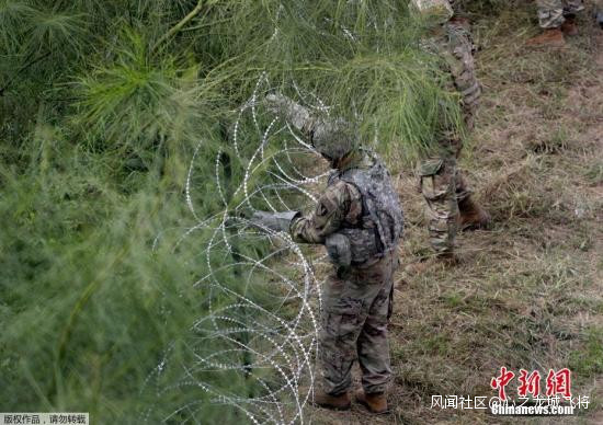 資料圖:當地時間2018年11月2日,美國得州Hidalgo,中美洲移民大軍壓境美國,美國士兵在美墨邊境安裝鐵絲網嚴防移民入境。 美國國務院表示,未來將與像路德教會移民難民服務組織這樣的機構合作,給出恢復難民來美的計劃,包括為那些受到延遲影響的難民重新安排來美行程。