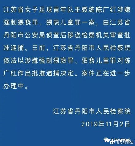 11月2日,江蘇省丹陽市人民檢察院宣佈:日前,依法以涉嫌強制猥褻罪、猥褻兒童罪對江蘇省女子足球隊青年隊主教練陳廣紅作出批捕決定,案件正在進一步調查中。