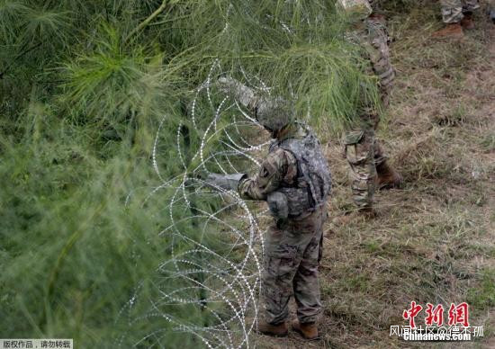 資料圖:當地時間2018年11月2日,美國得州Hidalgo,中美洲移民大軍壓境美國,美國士兵在美墨邊境安裝鐵絲網嚴防移民入境。