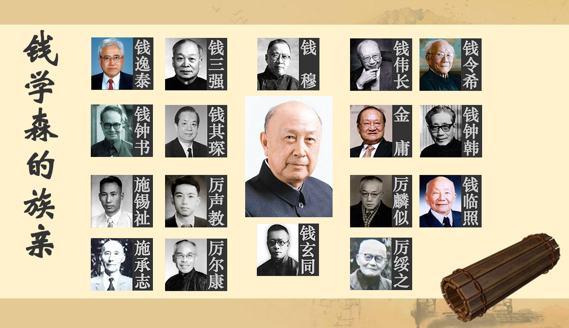 更鮮為人知的是,現當代史上很多聲名卓著的大家也都是錢學森的族親,包括國學大師錢穆、近現代著名思想家錢玄同、著名外交家錢其琛、武俠小説大師金庸、近現代文教界代表人物厲麟似、新中國國際法泰斗厲聲教、中國西醫學教育先驅厲綏之、抗日愛國名將厲爾康、“兩彈一星”元勳錢三強、著名教育家錢偉長、著名作家錢鍾書、民國開國名將施承志、新中國鐵路事業的開拓者和奠基人施錫祉、中國計算力學工程結構優化設計的開拓者錢令希、中國科學史事業的開拓者錢臨照,以及中國科學院院士錢鍾韓、中國科學院院士錢逸泰、中國工程院院士錢易、中國工程院院士錢鳴高等。