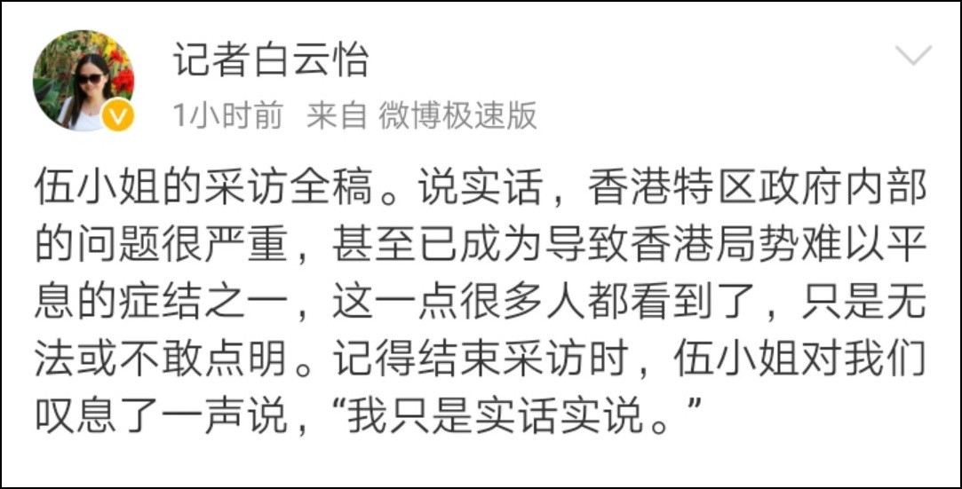 而在採訪結束時,伍淑清還嘆息了一聲説,“我只是實話實説。”