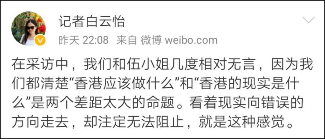 白雲怡感慨,比起之前的一次採訪,伍淑清對於香港未來的預測更加悲觀了。而在採訪過程中,雙方是數次相對無言,“因為我們都清楚‘香港應該做什麼’和‘香港的現實是什麼’是兩個差距太大的命題。看着現實向錯誤的方向走去,卻註定無法阻止,就是這種感覺。”