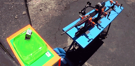 然而殺傷力依然不減!子彈幾乎是橫着出膛穿透了凝膠,初速卻依然與45度彎曲的槍管幾乎一樣。不過這次的子彈在出膛後的姿態就不穩定,想必射程會受到很大影響。