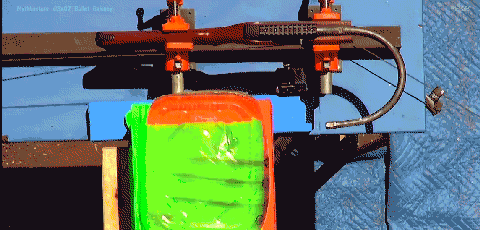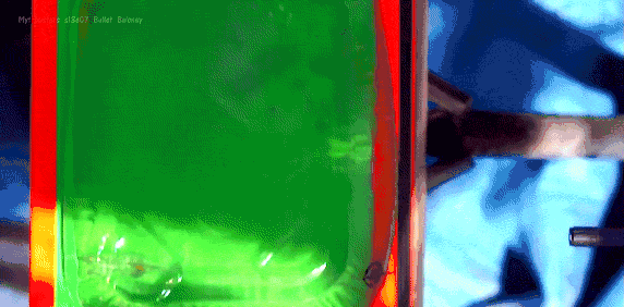 然後開始試驗,凝膠子彈成功的穿透了凝膠,與第一次看不出明顯差別。但是初速稍微慢了一些,能量損失大約7%。