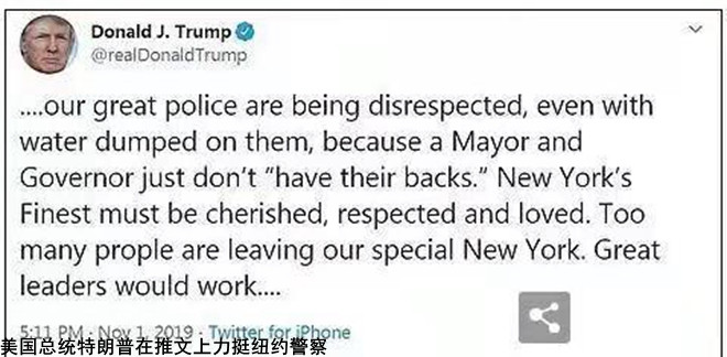 第一個“雙標”。一方面,美國政客和媒體對Hk那些暴徒美化為“自由鬥士”,而HK維護社會法治秩序的警察卻被污衊為“暴力暴徒”;另一方面,美國對紐約暴力執法的警察稱之為“紐約最美好的人”(特朗普語),而對正常反映自己訴求的示威者被污稱為“不安全”。