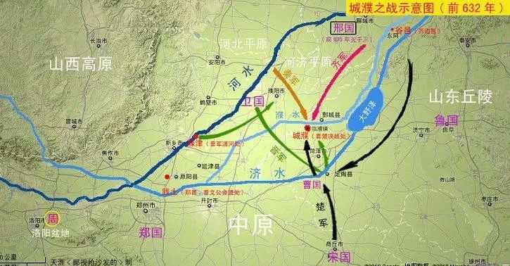 所謂的背水一戰,是需要自燒渡船以示決心的。而晉國選擇在城濮這個重要的渡口處駐紮,恰恰是因為剛剛登上君位的晉國,也沒有足夠的信心戰勝兵鋒正盛的楚軍。如果晉軍在城濮戰敗,他們可以迅速渡過濮水,然後延濮水之北,西向至黃河。在那裏有一個渡口叫作“棘津”,進入河北平原。晉軍正是從那裏渡過黃河,進入河濟平原的。