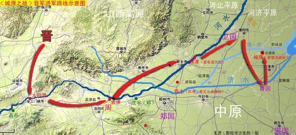 晉軍這次軍號行動的進軍路線,應該是先從“太陽渡”(也就是被滅的南北虢的所在地)南渡,然後延黃河南岸東行至洛陽盆地,再經由孟津北渡黃河進入河北平原(孟津就是當年武王伐紂渡河處,洛陽盆地進入河北平原的主要渡口)。而晉軍如果戰敗由“棘津”退入河北平原後,將可以按原路回到晉國本部(臨汾——運城盆地)。