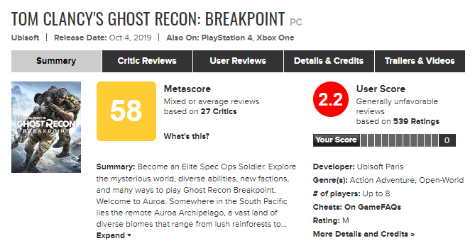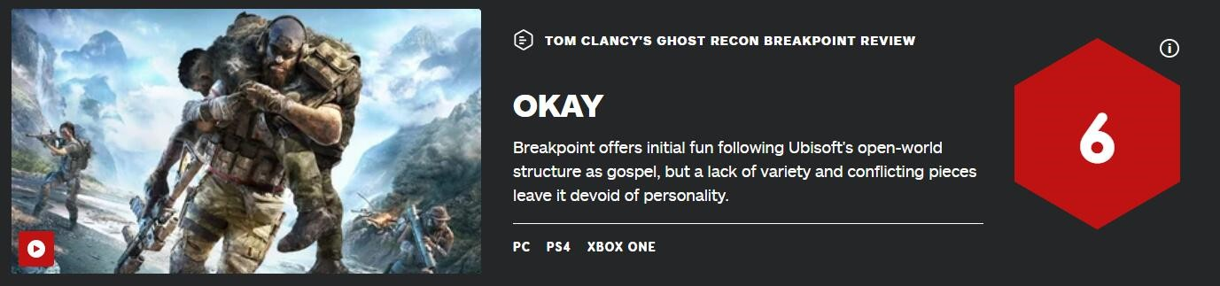 沉迷“公式化開放世界”的育碧,在把一大堆已經用過無數次的開放世界元素堆砌到《幽靈行動:斷點》上後,終於惹怒了受夠了“公式化開放世界”的玩家們。新增的裝備等級系統並不契合幽靈行動這個戰術射擊遊戲系列,包括同步射擊等系列特性的缺失以及遊戲場景中處處體現出的“趕工”、“模塊化製作”、“AI自動生成”的痕跡顯然缺乏誠意。本作IGN評分僅6分,在Metacritic上的玩家評分甚至已經跌至2.2分,也是創造了整個幽靈行動系列的評價新低。