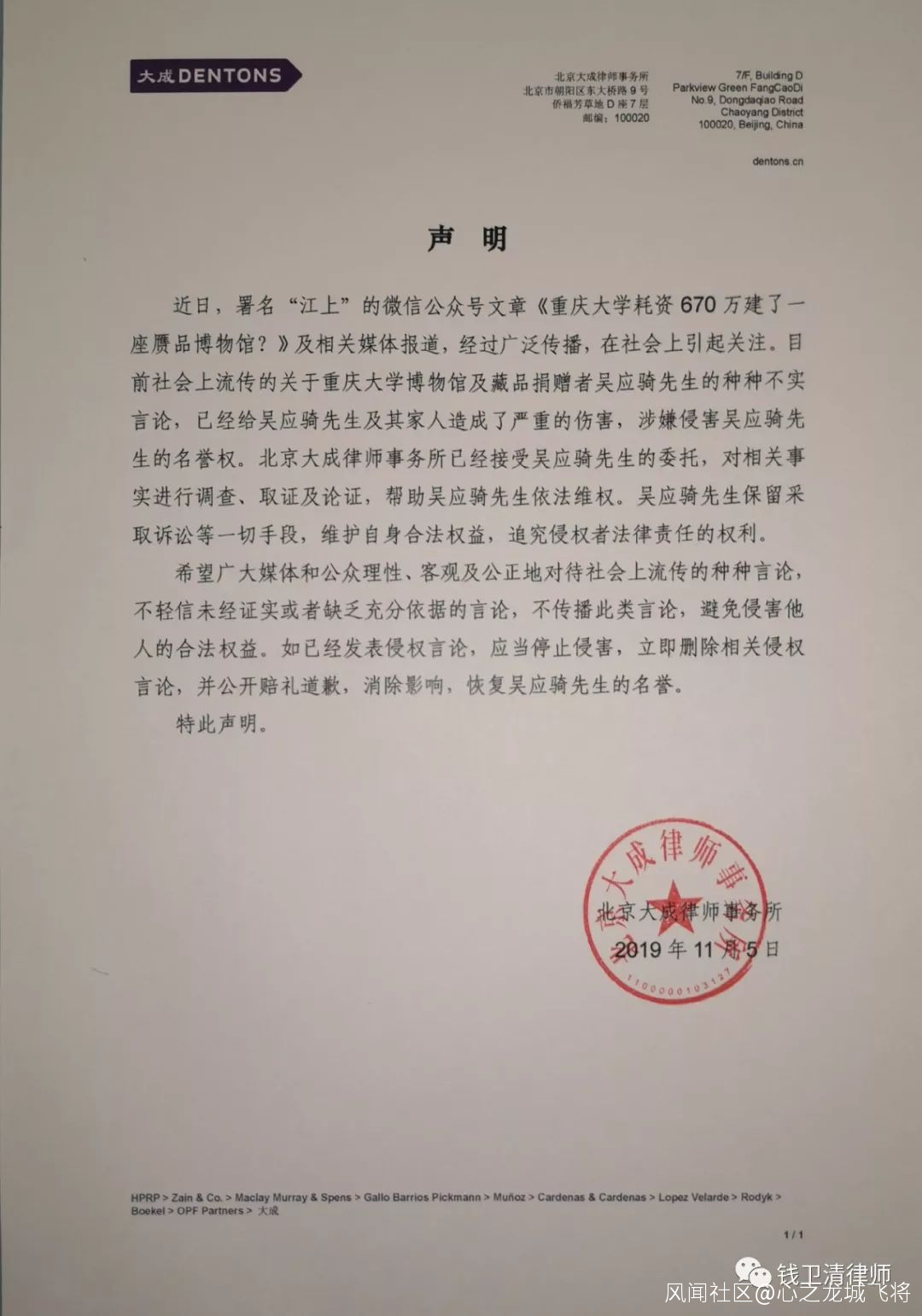 近日,署名“江上”的微信公眾號文章《重慶大學耗資670萬建了一座贗品博物館?》及相關媒體報道,經過廣泛傳播,在社會上引起關注。目前社會上流傳的關於重慶大學博物館及藏品捐贈者吳應騎先生的種種不實言論,已經給吳應騎先生及其家人造成了嚴重的傷害,涉嫌侵害吳應騎先生的名譽權。北京大成律師事務所已經接受吳應騎先生的委託,對相關事實進行調查、取證及論證,幫助吳應騎先生依法維權。吳應騎先生保留採取訴訟等一切手段,維護自身合法權益,追究侵權者法律責任的權利。