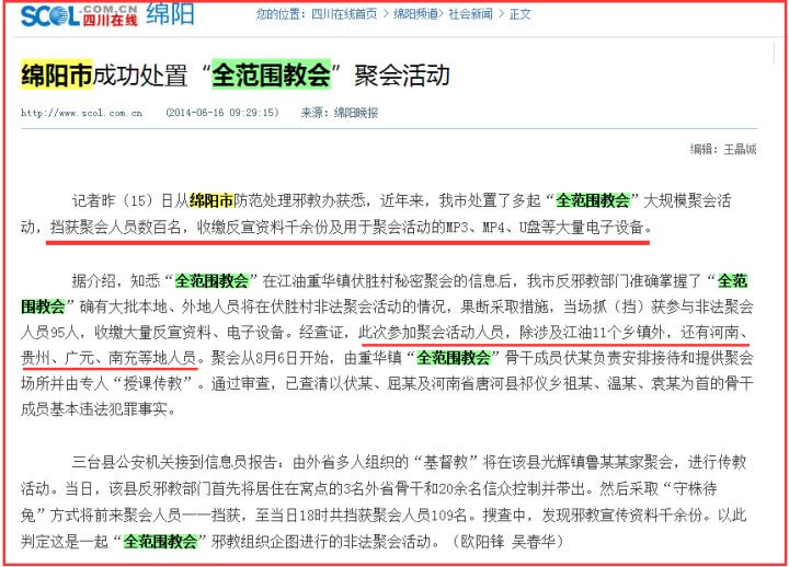 2014年6月,四川綿陽處置邪教“全範圍教會”聚會。
