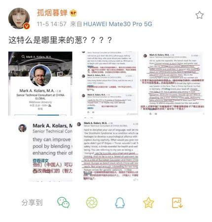 5日下午15時左右,網友@孤煙暮蟬在微博“掛”出了一名外籍男子在職業社交網站領英(LinkedIn)發表不當涉華言論的截圖。這名男子聲稱,自己在中國科學院工作。此外,這名男子還發表了多條被網友批評為“種族歧視”的不當言論,其中包括“歐洲的血統中國永遠趕不上”、“討厭骯髒的黃種人”、“中國男人光説不做、只敢擺架子”、“(中國人)不夠聰明,近親繁殖太久了”等。