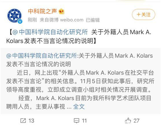 11月5日,據微博網友爆料,一名疑似在中國科學院就職的外籍人員Mark A. Kolars在職業社交網站領英(LinkedIn)發佈不當涉華言論,引發網友憤怒。當晚17時30分,中國科學院自動化研究所官方微博發佈情況説明稱,經查,Mark A. Kolars系該研究所科學藝術團隊項目聘用人員,已立即對該人員停職檢查。