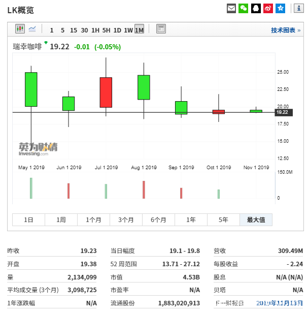 根據YCharts的數據顯示,幾乎所有的華爾街覆蓋該股的分析師都給予了公司“買入”評級。上市以來,瑞幸咖啡股價累計下跌4.38%,目前報19.22美元,市值45.3億美元。