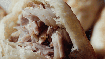 “咬第一口時牙齒先破開脆皮,咔吧一聲,唇邊立刻帶有淡淡的烤糊油香,然後再一氣切開數十層軟面,待得第一口合攏,酥皮碎片、麥香面片以及燻肉精華已經在舌尖混為一團,滿口噴香。”
