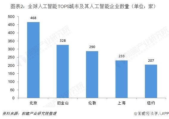 從獨角獸企業的數量看,美國擁有18家,中國擁有17家;從人工智能企業城市分部來看,北京以468家企業個數拔得頭籌,其次為舊金山,328家企業;倫敦則位列第三,為290家;上海緊隨其後,為233家;紐約排第五,為207家。