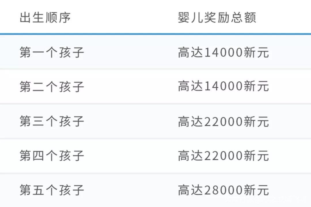 從2015年開始,在新加坡生孩子的獎勵金由之前的6000新元提高到了8000新元(約41500人民幣),加上給新生兒的其他補助,生第一個孩子的獎勵總額已達到14000新元(72500人民幣)。