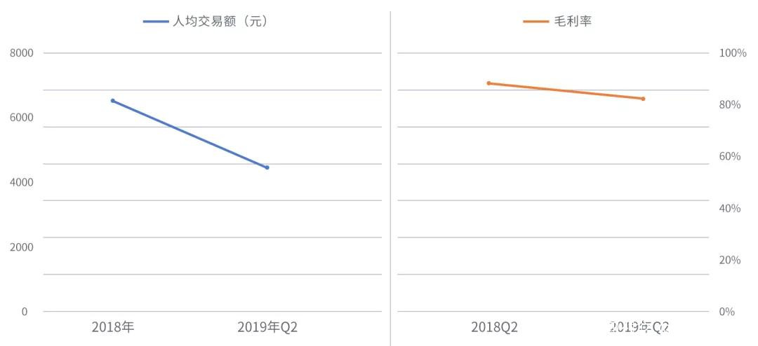 如下圖所示,新氧單客交易額由2018年的6709元(交易額21億元/31.30萬用户),降至2019年二季度的4431元(交易額8.929億元/20.15萬用户),降幅達34%。不止是單客交易額,新氧毛利率,也由2018年Q2的86.1%,降至2019年Q2的82.5%。