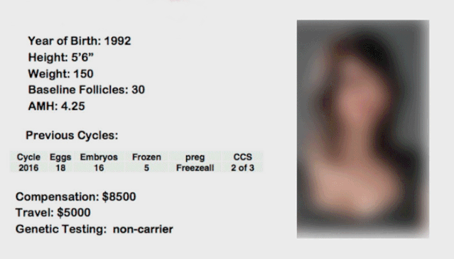 點開生育診所的網站,就可以看到大量捐卵者的信息,像超市貨架的上的商品一樣,註明國籍、年齡、身高、血型、學歷、髮色……