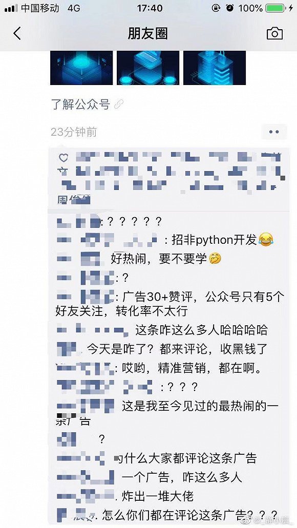 6張不明所以的圖片,加上20個字的文案,一條“Python訓練營”的推送,成了這屆朋友圈裏最魔性的存在:這大概是你見過的評論點贊數最多的一條朋友圈廣告,沒有之一。
