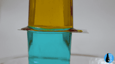3 像這樣把蜂蜜水扣在白開水杯上面,然後拉開塑料片,觀察兩種液體的混合。