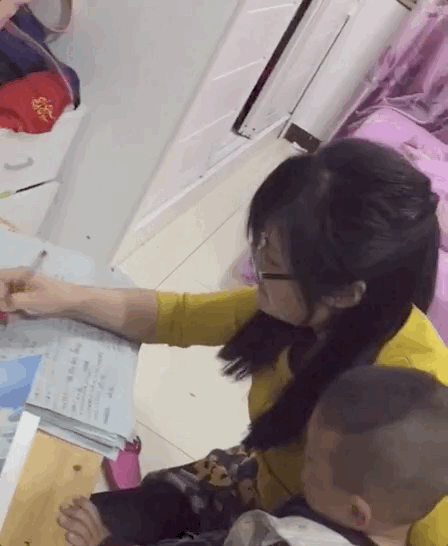 這位媽媽晚上下班回到家,還有許多卷子等着她批改,可兒子非鬧着要媽媽抱。