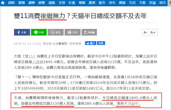 是的,您沒看錯,這篇報道的記者戴瑞芬,居然拿着今年”雙11”半天的成交額(1845.4億)跑去對比了2018年”雙11”全天的成交額(2135億),然後就得出了今年”雙11”“後繼無力”的觀點。