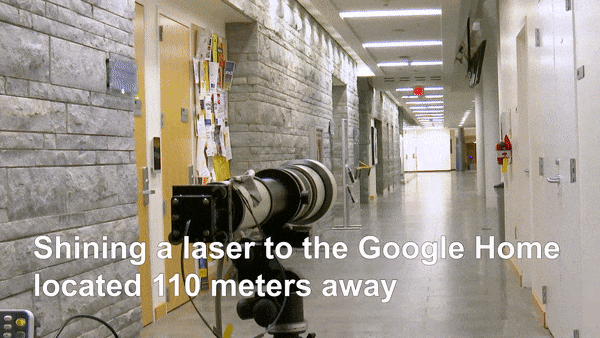 不需要太強的激光,普通激光筆的強度就可以,就算距離有110米遠,就算在外面的另一棟建築裏,就算要穿過玻璃窗,都可以控制你家裏的智能音箱、手機和平板們。