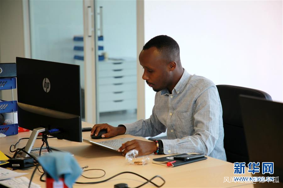 8月19日,在盧旺達首都基加利,盧旺達電商公司HeHe創始人之一戴維·恩舒蒂在公司內辦公。新華社記者 呂天然 攝