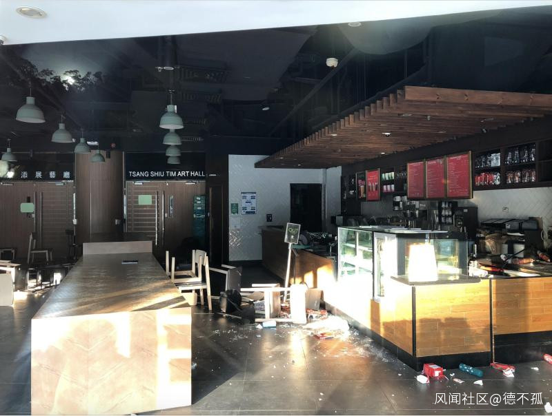 走出賽馬會大堂,來到學校廣場。港科大標誌性的紅色日晷也未能倖免,身上貼滿了各種標語。不遠處的中國銀行營業廳大門緊閉,玻璃門上塗滿了各種辱華詞語,據説之前黑衣學生還將橡膠水管塞入門縫中,想搞個“水漫中行”,所幸被人阻止未遂。讓我有點疑惑的是,廣場邊的星巴克咖啡店也被搞得一片狼藉,桌子躺在地上、玻璃渣子滿地。“它有中資背景?它得罪了黑衣人?它遭了池魚之殃?”我心裏直犯嘀咕,但也不敢找人去問。按照習慣,走進大學總要買個校徽當作留念,但無論是邊上的紀念品店還是校園書店,都很識相地關上燈、閉上門,空無一人。