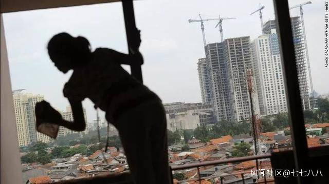 △在雅加達一座公寓中擦玻璃的家傭圖/CNN
