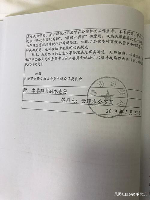 今年3月,薛鋭權向雲浮市委組織部申訴。3月個後,市委組織部維持了市公安局的辭退決定。之後,薛鋭權向雲浮市公務員局公務員申訴公正委員會申訴,後者依舊維持辭退決定。