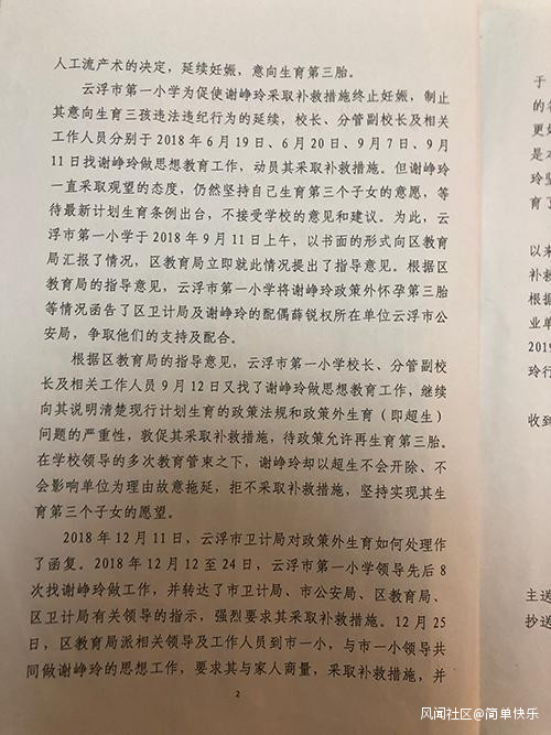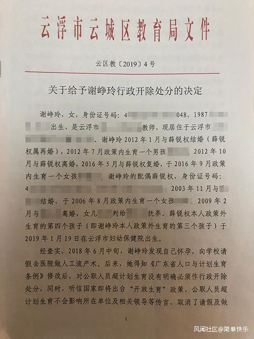 相關文件顯示,2018年12月11日、12月25日,當時的雲浮市衞生和計劃生育局(注:已改為雲浮市衞生健康局)在答覆市公安局的諮詢時表示,謝崢玲現屬於政策外懷孕,待她生育後,薛、謝所在單位按有關規定處理。